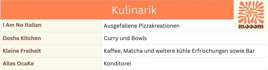 Deinen Hunger stillst Du mit Kuchen von Alles O’Cake, mit Klagenfurt’s bester Pizza von I AM NO ITALIEN oder Curry & Co von Dosha Kitchen. Kaffee & kühle Drinks kommen von der Kleinen Freiheit.